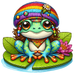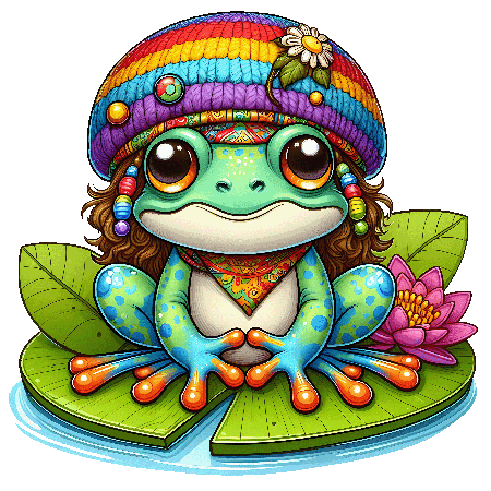 Boho Frog Sitting on Lily Pad with Rainbow Beanie, Flower, and Cute Hippie Style