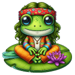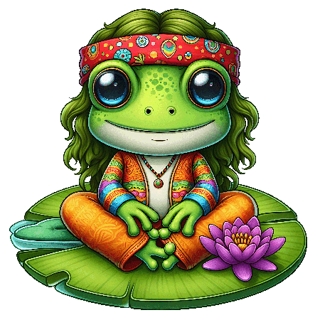 Cute Boho Frog Sitting on Lily Pad with Headband, Lotus Flower, and Retro Hippie Outfit